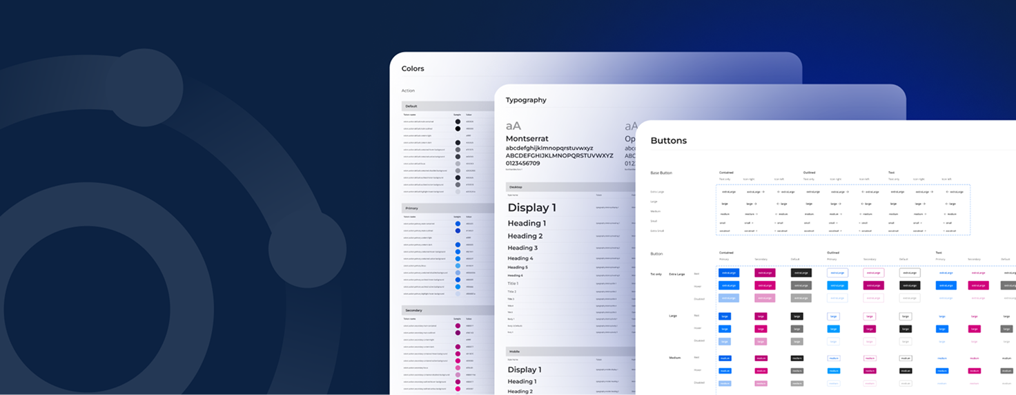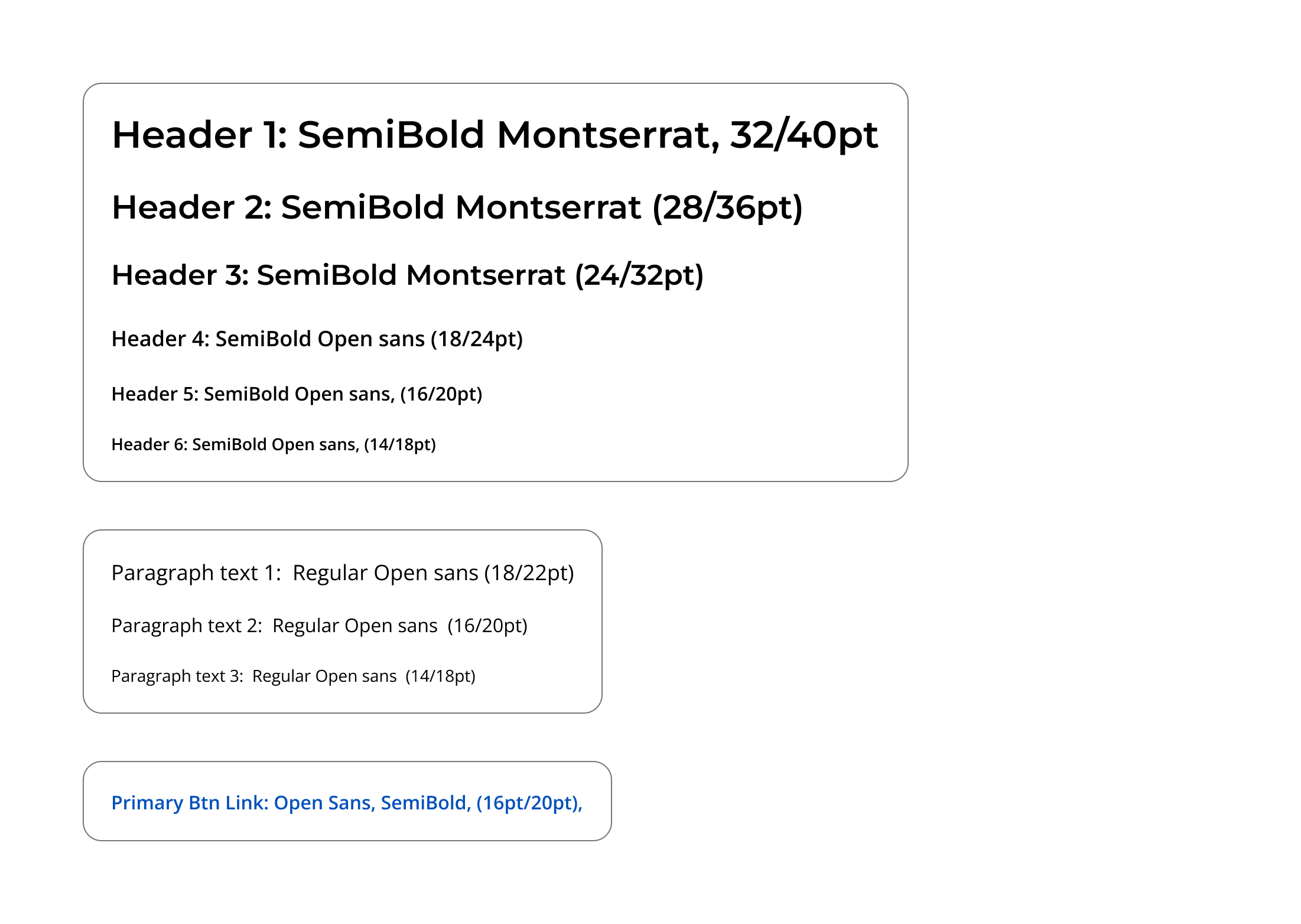 Typography used two typefaces with clear roles. Montserrat handled headers at display and heading sizes. Open Sans covered body text, labels, and UI copy. I defined a full scale across both, with six heading levels, three paragraph sizes, and consistent line heights throughout.