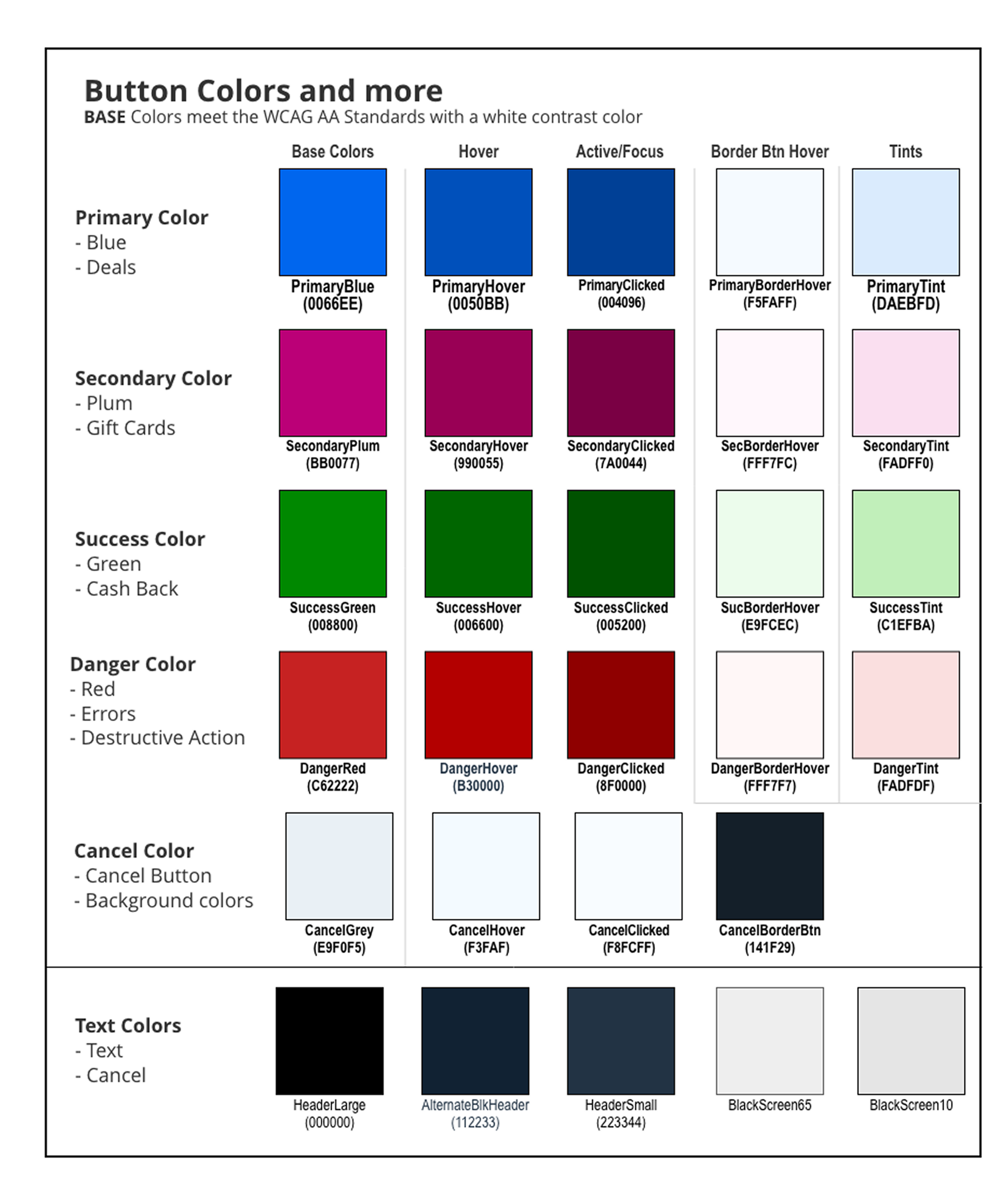 I structured the color system semantically, not just as a palette. Every color role had a full set of states: base, hover, active, border, and tint. That covered primary blue, secondary plum, success green, danger red, cancel grey, and text colors. Engineers could implement these predictably because the naming reflected intent, not just appearance. Colors were validated against WCAG AA standards at the token level, which meant accessibility was built into the defaults rather than audited after the fact.