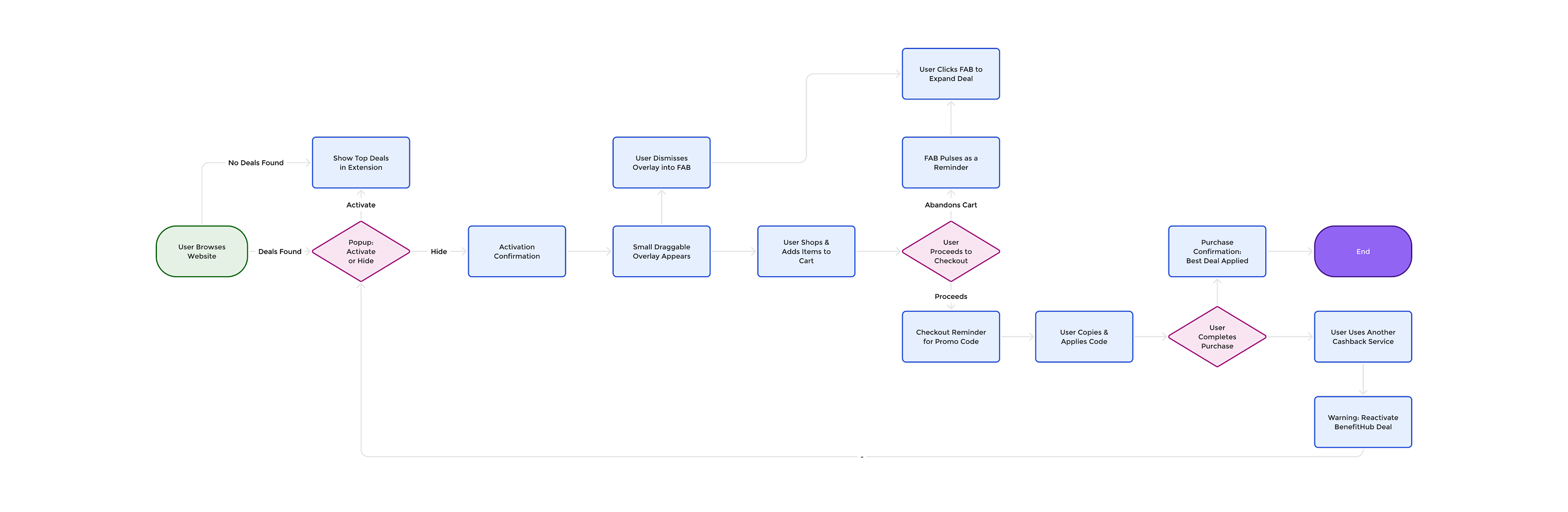 User flows and wireframes were created to map every possible state of the extension—from browsing a website with no deals available, to activating and confirming offers, to reminders at checkout. These visuals helped align stakeholders and guided development through a clear, consistent vision.