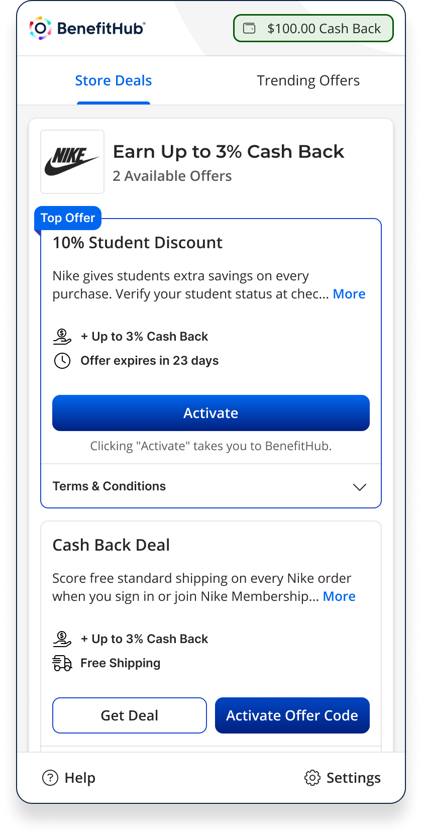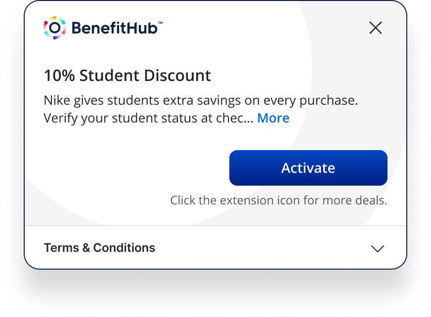 The Browser Extension established BenefitHub as a trusted shopping assistant, delivering a seamless and non-intrusive way for members to save money online. The design increased deal activation rates, improved checkout usage of promo codes, and positioned BenefitHub alongside top competitors like Honey and Rakuten.