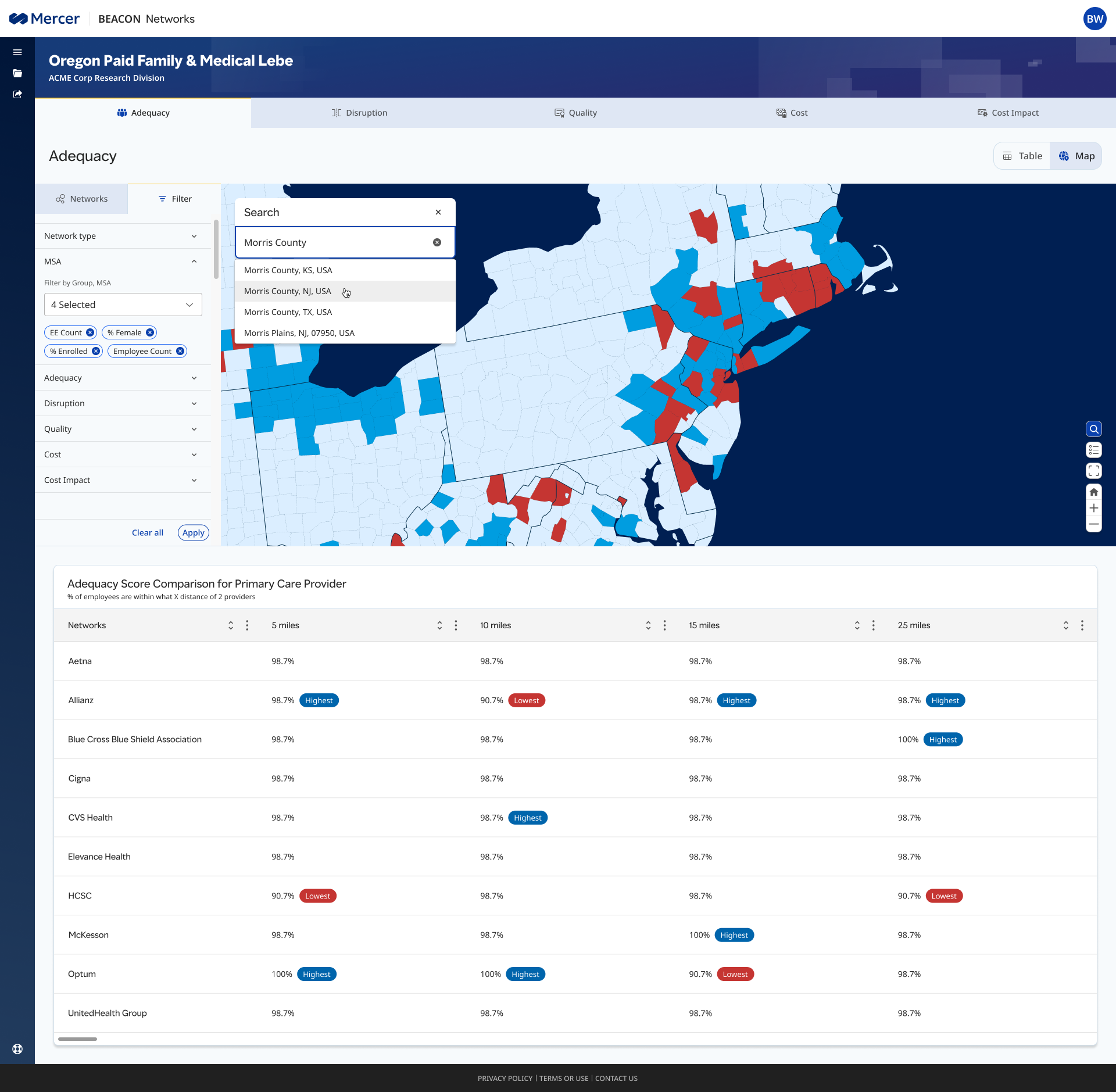 We designed a unified, map-centered application that brought all three data sets into one interface. Consultants could view network quality, discounts, and claims data together. Filtered by region, physician specialty, or network tier, without leaving the screen.